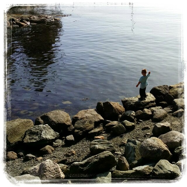 På hjemveien var vi skikkelige eventyrere som balanserte over steinene for å komme oss over sjøen!